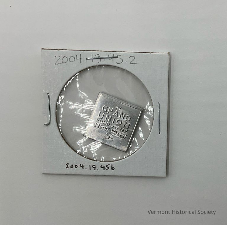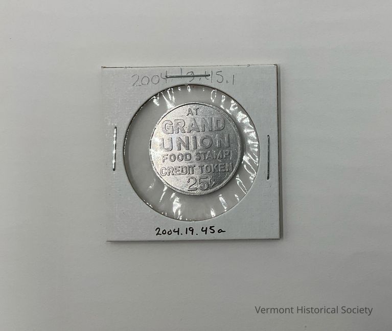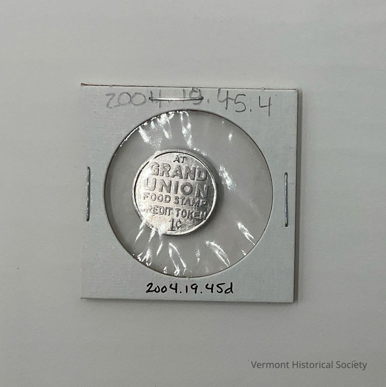 Four aluminum tokens issued by the Grand Union grocery chain. Face reads (on each): "AT / GRAND / UNION / FOOD STAMP / CREDIT TOKEN /...(amount)" One is for 25 cents (sign), two are for 5 cents and one is for 1 cent.The reverse reads:"FOOD STAMP / CREDIT TOKEN / REDEEMABLE ONLY IN / ELIGIBLE FOODS / ... then the amount.
