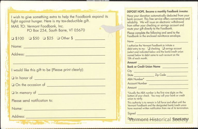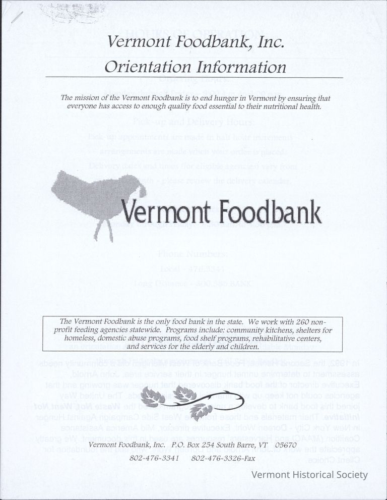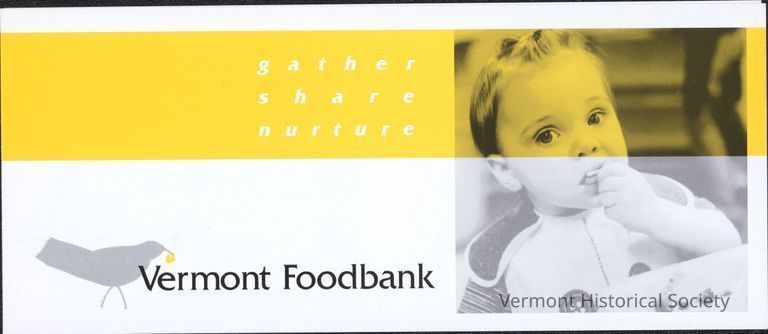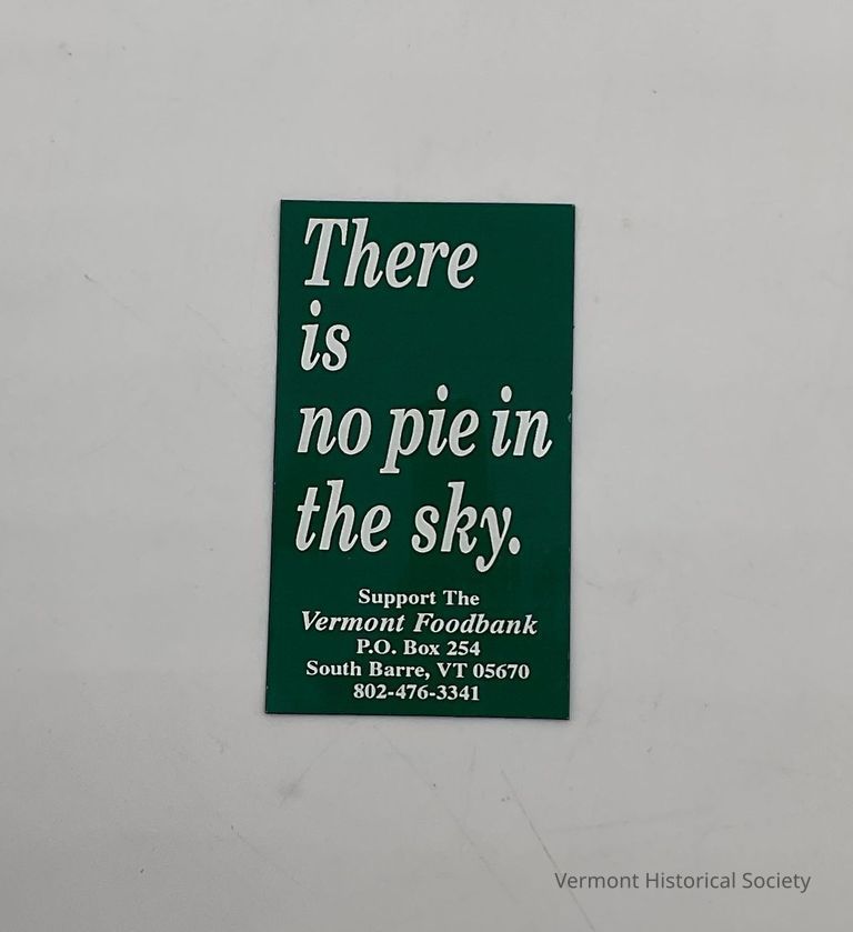Green magnet with white lettering: "There is no pie in the sky. Support the Vermont Foodbank, P.O. Box 254, South Barre, VT 05670, 802-3341".
