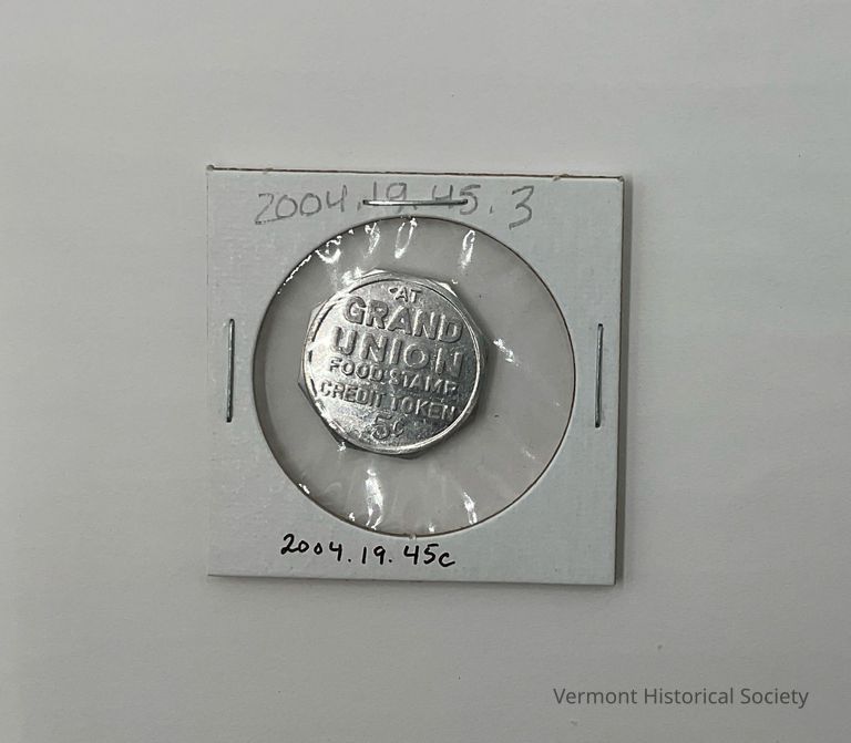 These are tokens that someone paying for their groceries at a Grand Union supermarket with coupons from the Federal Food Stamp program would receive in change rather than actual money. They could spend the tokens at the store on a subsequent shopping trip.