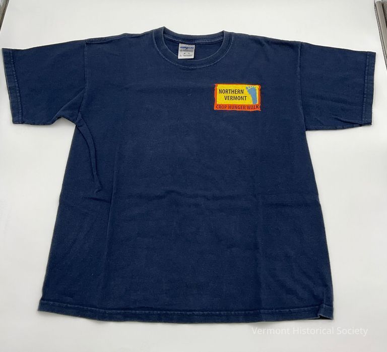 NORTHERN VERMONT CROP HUNGER WALK t-shirt. Navy blue with orange / yellow / light blue graphics. This 'Youth L' was made by Gildan. On the left chest is an irregularily shaped rectangle with the above words and the graphic of a bare foot. The back lettering and graphics are all in orange beginning with the same lettering above. Below that are profiles of all types of 'walkers' including a person in a wheelchair, children being pulled in a wagon and a dog all over the text: "ENDING HUNGER ONE STEP AT A TIME" Below that are a list of sponsors with the largest text being for "GARDENER'S / SUPPLY COMPANY".