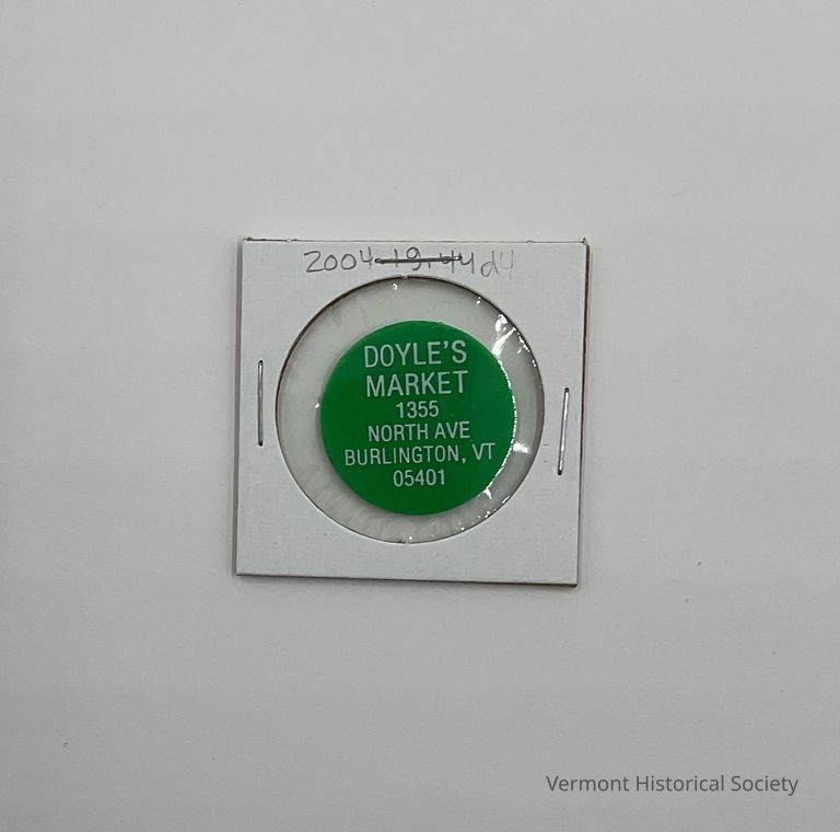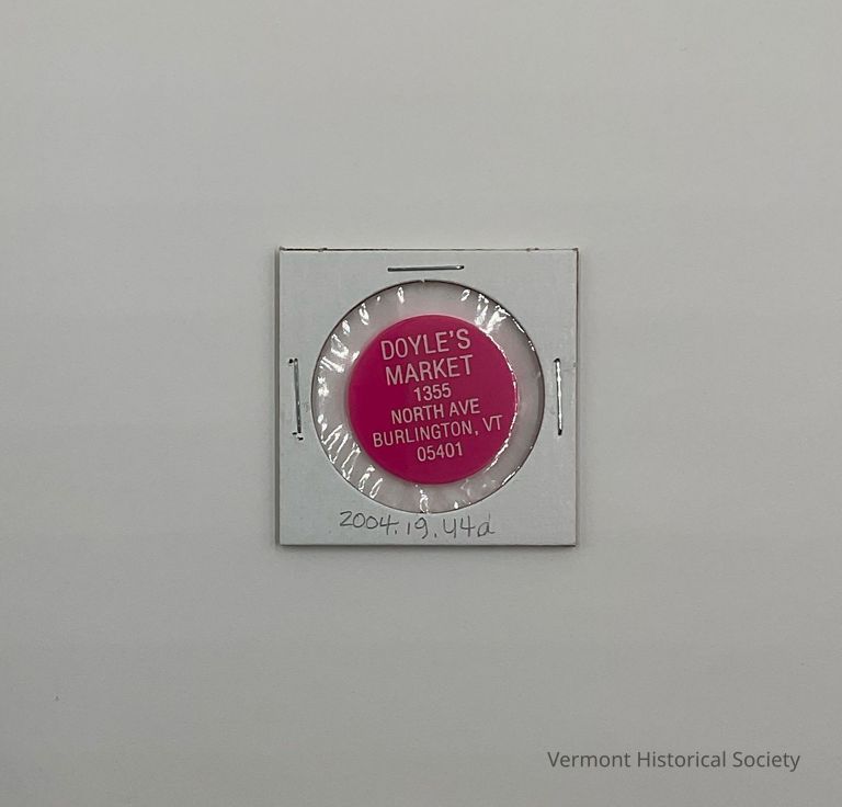 Tokens for (obverse) "DOYLE'S / MARKET / 1355 / NORTH AVE / BURLINGTON, VT / 05401" Four colors, all plastic, pink, bright green, orange, royal blue. Reverse: "IN FOOD STAMP CREDIT / ELIGIBLE FOODS" Pink = 50 (cents sign) Orange = 25 (cents) Blue = 10 cents Green= 5 cents