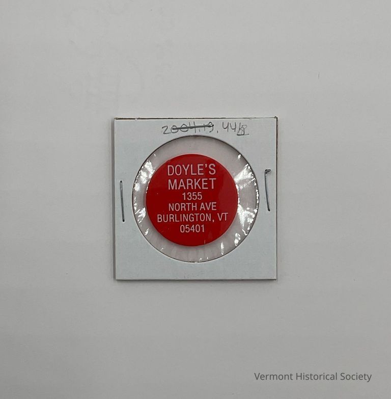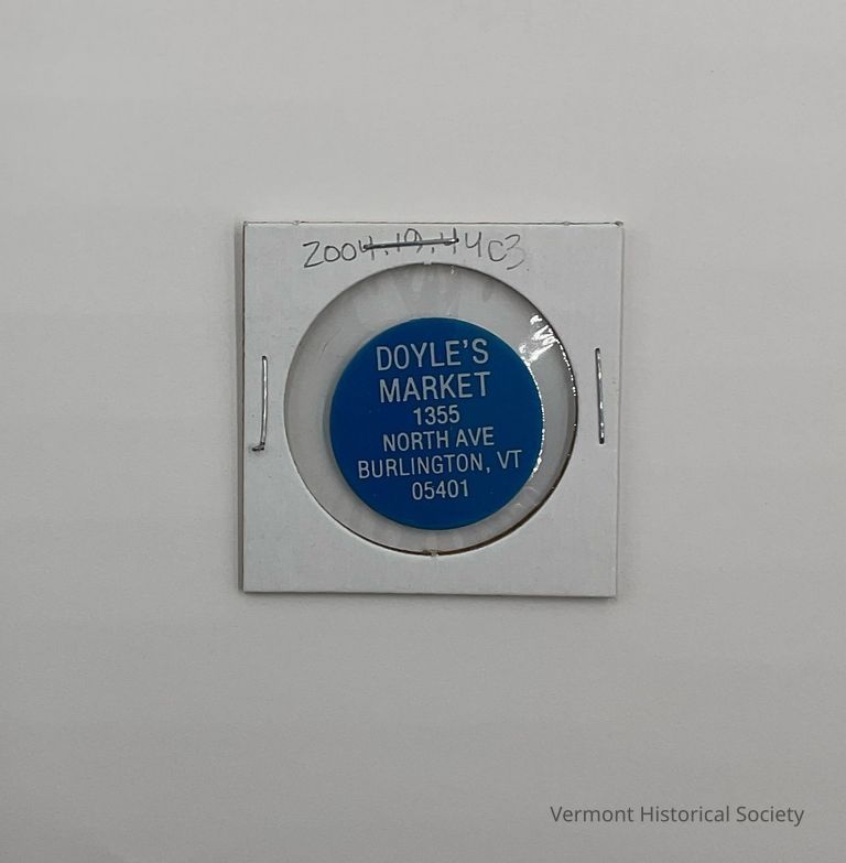 These are tokens that someone paying for their groceries at Doyle's Market in Burlington with coupons from the Federal Food Stamp program would receive in change rather than actual money. They could spend the tokens at the store on a subsequent shopping trip.