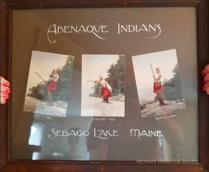 Framed collage with three colorized photographs of an individual in native costume with a long gun. Work is titled, "Abenaque Indians" and subtitled, "Sebago Lake Maine." Costume includes large, red bag and feathered headdress. Background of large rocks, pine trees and water. (L-R) First photo shows person in profile holding gun at waist level and captioned "Um~Ha." Second photo shows person bent at waist in three-quarter view aiming gun over left wrist with caption, "Caramb~Ha." Third photo shows person facing to the left and looking at the camera, holding gun upright and captioned, "Lung~Ha."