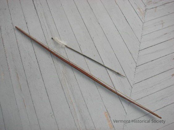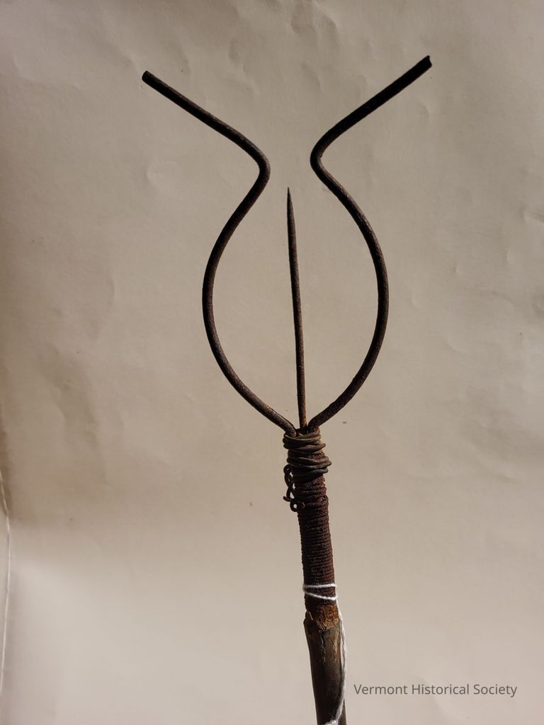 This is a late example of an ancient trident fish spear style that is distinctive to the Wabanaki peoples. The central impaling spike is flanked by two “leads,” made from steel wire. This fishing spear was found in a garage sale in Newport, VT, a relic of local Native fishing systems. It is a recycled, tubular steel fishing rod tipped with a sharp spring wire spike, flanked by two spring wire prongs. It is wired together steel wire… This is a diminutive version of the highly distinctive Wabanaki fish spear executed in metal rather than wood. (Nulhegan Band 2010 Recognition Petition: 42)