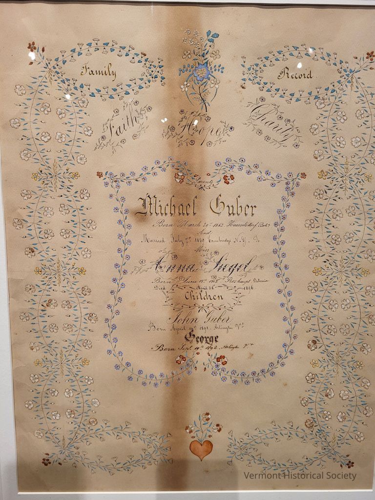 This family record of a German immigrant to Vermont memorializes a marriage. Space was left for the later addition of children. The style is similar to that of Fraktur, a Germanic illustration technique for memorializing life events. Michael Guber immigrated from what was then Bohemia, to Vermont at the age of 23. He met his wife, also an immigrant from Bohemia, and married in Cambridge, New York. Children John and George were born in Arlington, Vermont.