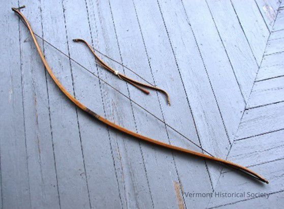 The heavily oxidized bow is made from ash (CHECK THIS), rectangular in cross section, with a decorative groove incised on the sides and red ochre painted stripes. Structurally, the bow is in perfect shape complete with its original gut bowstring. It is stylistically different than other known bows from the region, and the only indicator of age is the gut bowstring, which probably phased out of use in the early 19th century in favor of Euroamerican vegetal cord. It is the only known really old Native style bow found in Vermont.