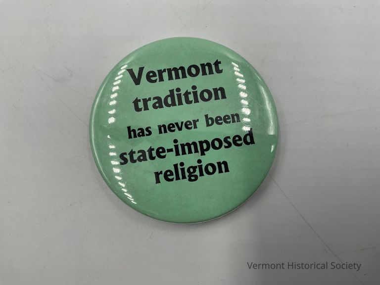 A pale green magnet with black lettering that says, "Vermont Tradition has never been state-imposed religion."