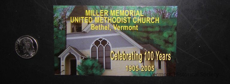Rectangular magnet with "MILLER MEMORIAL/ UNITED METHODIST CHURCH / Bethel, Vermont / Celebrating 100 Years / 1905 - 2005" The yellow writing is superimposed over a photograph of the church.
