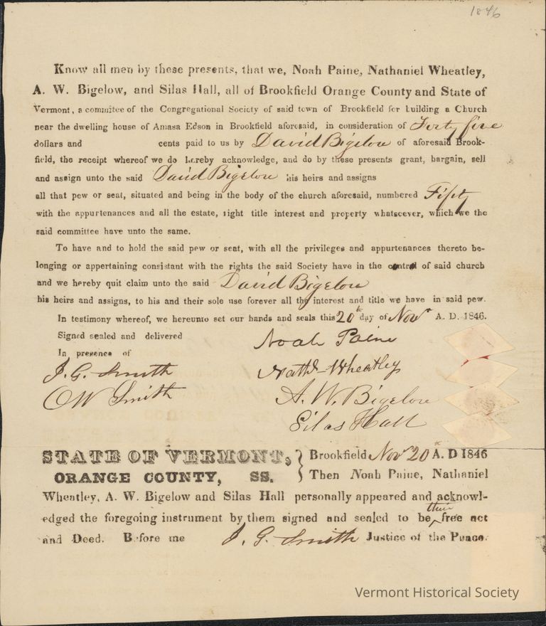 Document detailing a financial commitment to a family pew at a Congregational church in Brookfield.