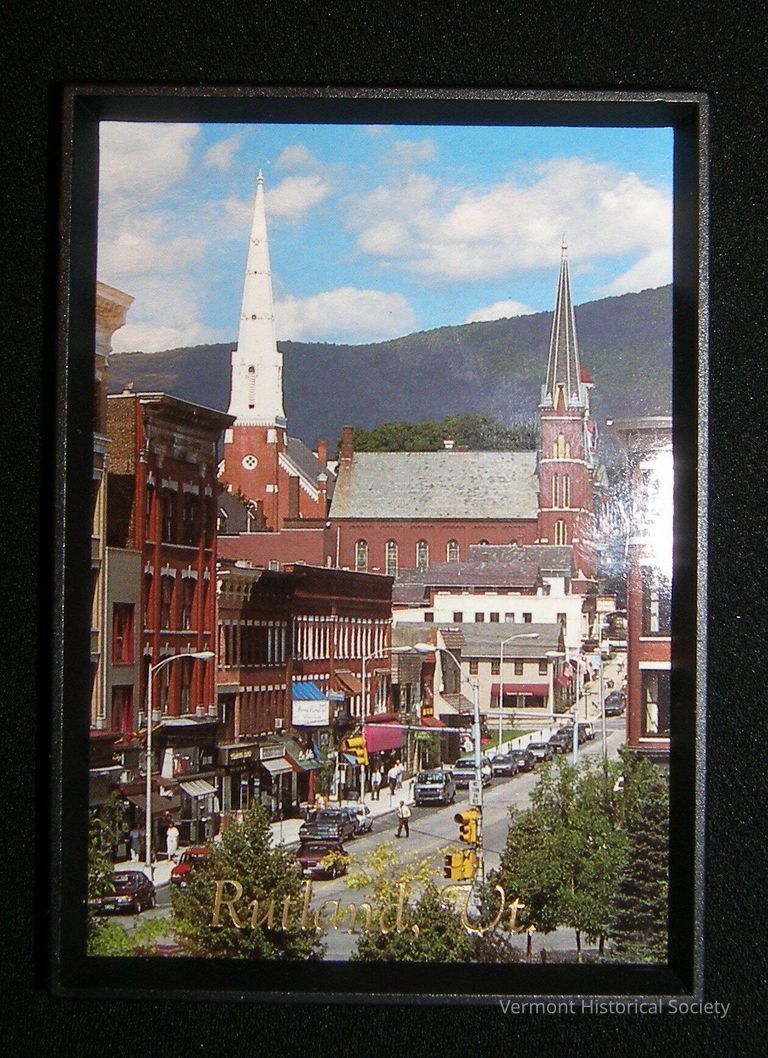 Photographic magnet showing a city street lined with shops. Two church steeples are in the background, and the who is in front of a large mountain. The bottom of the image is labeled, "Rutland, Vt." in gold. The back of the magnet bears the inscription, "SCENIC VERMONT / Eastern Illustrating Union, Maine Made in USA".