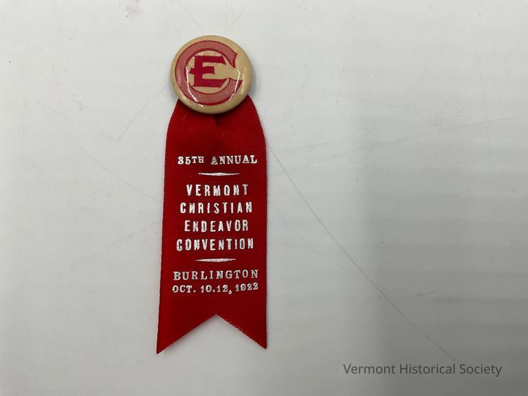 White button with the logo for the Society of Christian Endeavor -- an E within a C -- printed in red and an attached red ribbon. Printed in silver on the ribbon is: "35th annual Vermont Christian Endeavor Convention, Burlington, Oct. 10-12, 1922.