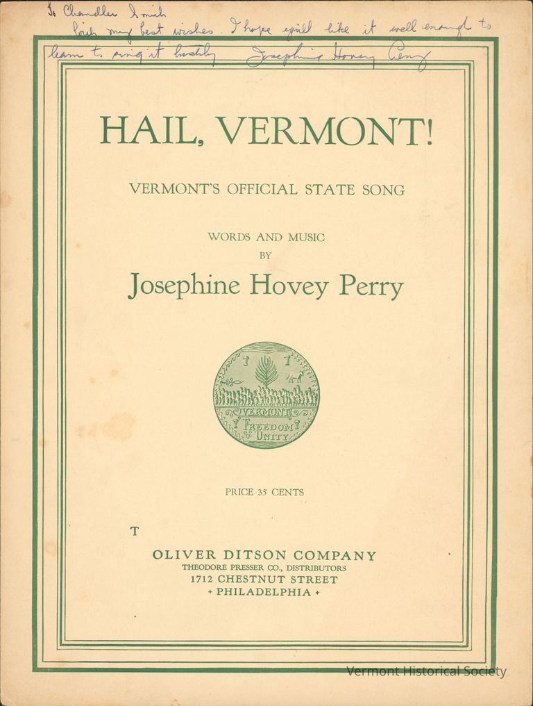 Sheet music for the song "Hail, Vermont!" by Josephine Hovey Perry
