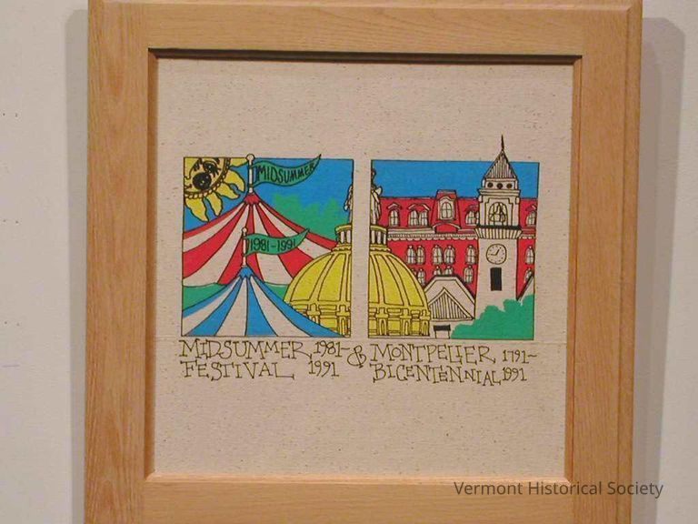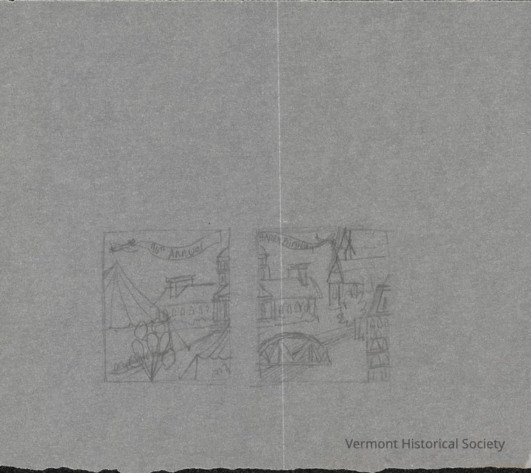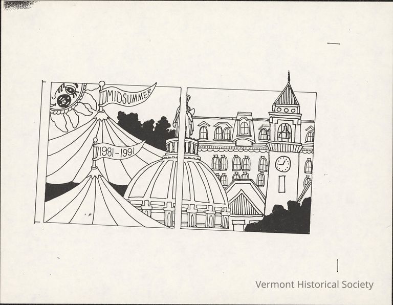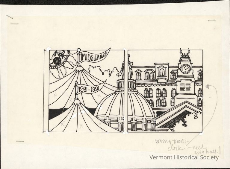 Pencil sketch showing two rectangular panels containing a scenic view of Montpelier, Vermont. The Vermont Statehouse is split between the two panels. The left panel contains a circus tent and balloons. The right panel contains a bridge, church, and building. A banner spans the top of the panels that reads, "40th Annual / Happy Birthday".