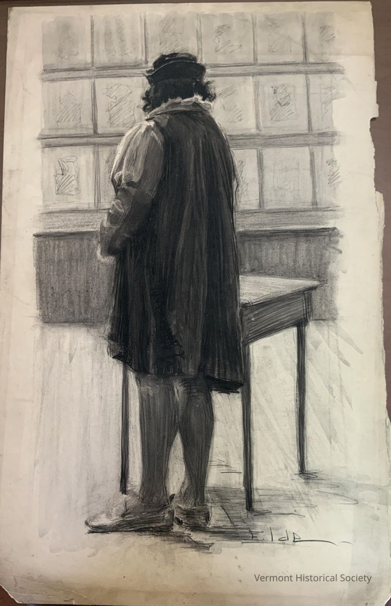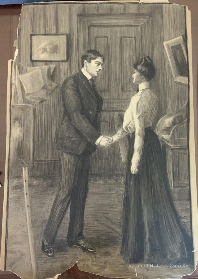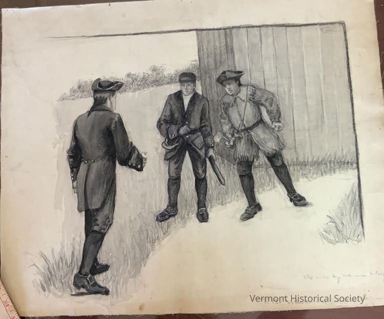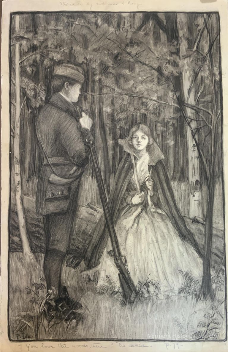 A drawing for the book Milton Blairlee and the Green Mountain Boys by Willard Goss Davenport. It shows a man in uniform with a gun talking to a woman in a cloak sitting on a log in the middle of a forest. It is signed in the bottom left corner.