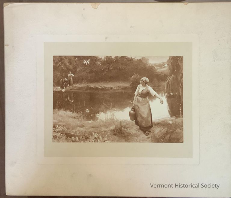 A sepia toned photograph of a painting of a woman carrying water from a river while two figures watch from the other side. It is mounted on cardboard. The river is surrounded by trees and long grass and there is a house in the distance. The woman in the foreground wears a headscarf and a dress that laces up the front over a blouse, and carries her water in a jug. Unsigned and undated.