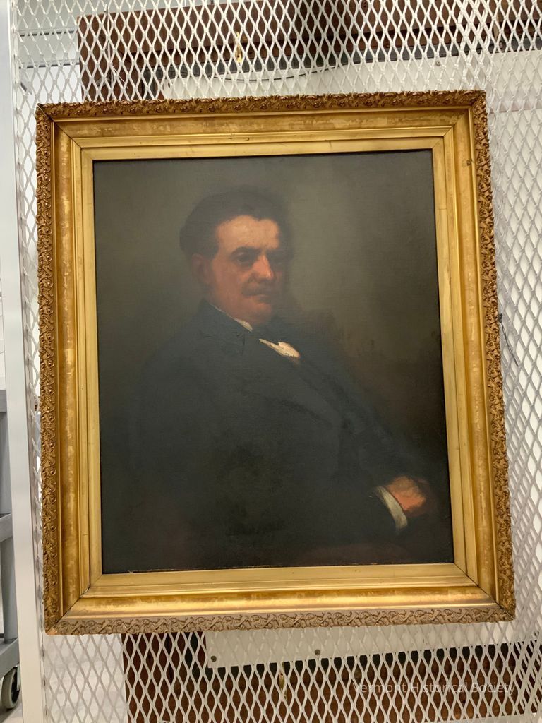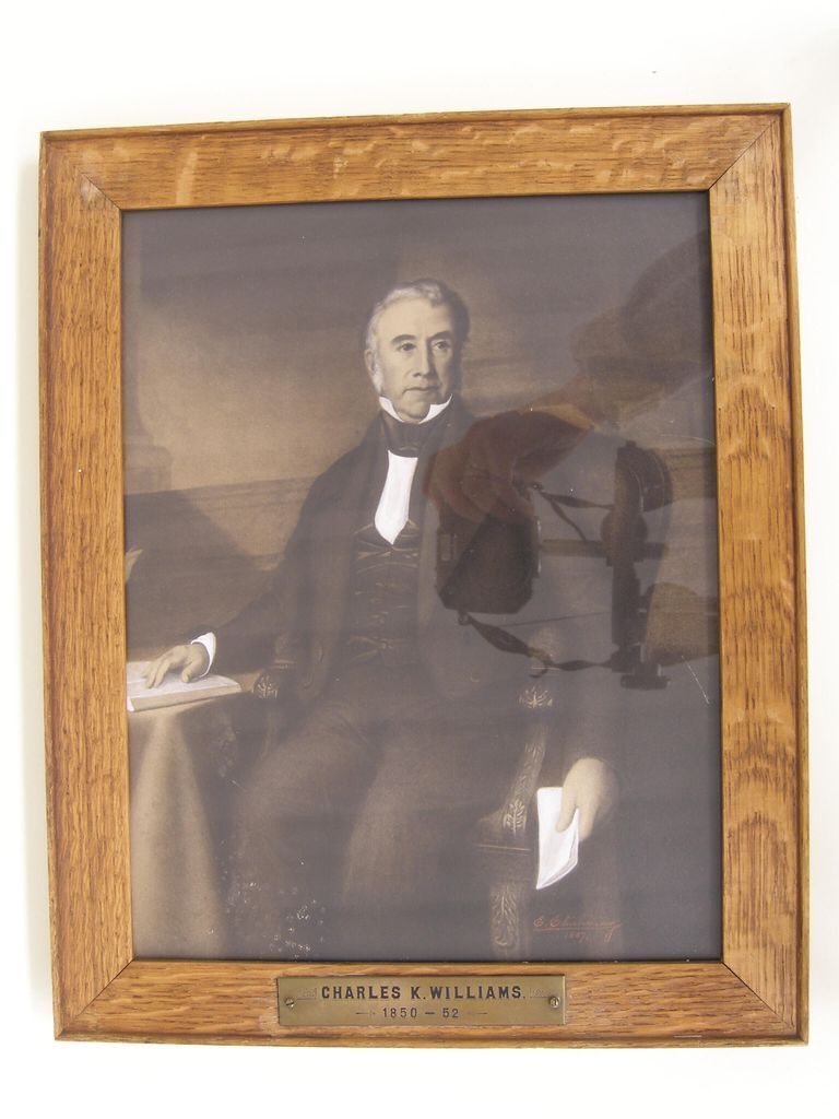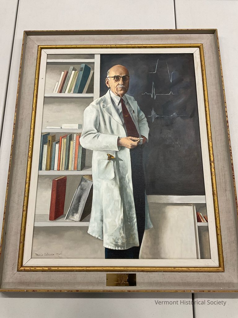 Oil on canvas portrait of Dr. Wilhelm Raab, M.D. Dr. Raab is centered in the painting with a bookshelf behind his left shoulder and a blackboard behind his right shoulder. The blackboard features ECG lines and the chemical formula for a catecholamine molecule. Dr. Raab has spectacles, a red tie, and a metal medical instrument in his white coat pocket. The bottom left corner is signed, “Francis Colburn 1960.” The wooden frame has gilded elements and grey paint, and a plaque that reads “WILHELM RAAB, MD / CHAIRMAN DIVISIONS OF / EXPERIMENTAL MEDICINE / UNIVERSITY OF VERMONT / COLLEGE OF MEDICINE / 1945-1960 / PRESENTED APRIL 26, 1960 / BY / THE FACULTY.”