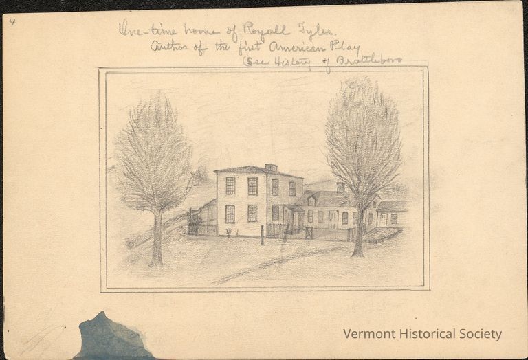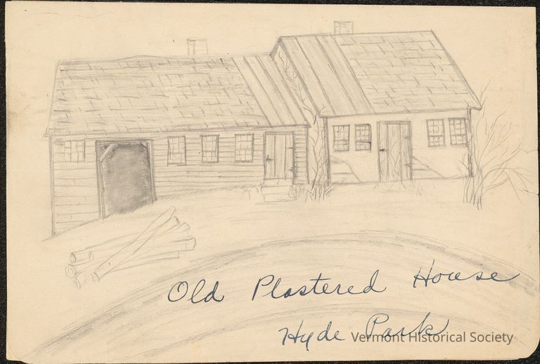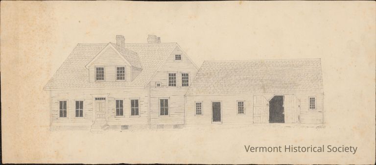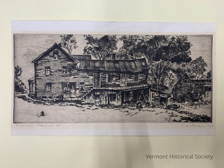 Rectangular engraving showing a large tenement building from the side. The building faces the left and appears to consist of an original structure with additions added onto the back in multiple level, including a second-story landing and a lean-to. A second building appears in the background with roughly the same shape. The subject, "Tenement, Pittsfield VT.", is inscribed in pencil at the bottom left, and the artist, "S. [illeg] Brian [illeg]", is inscribed in pencil at the bottom right.