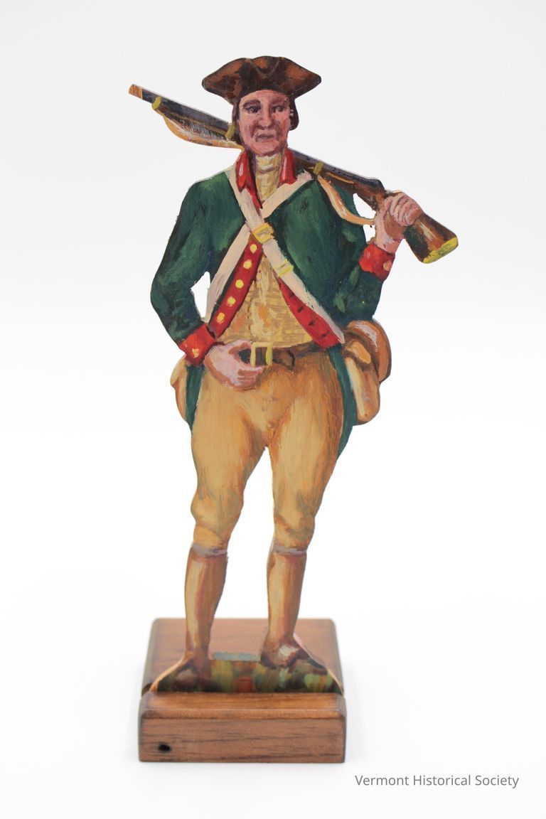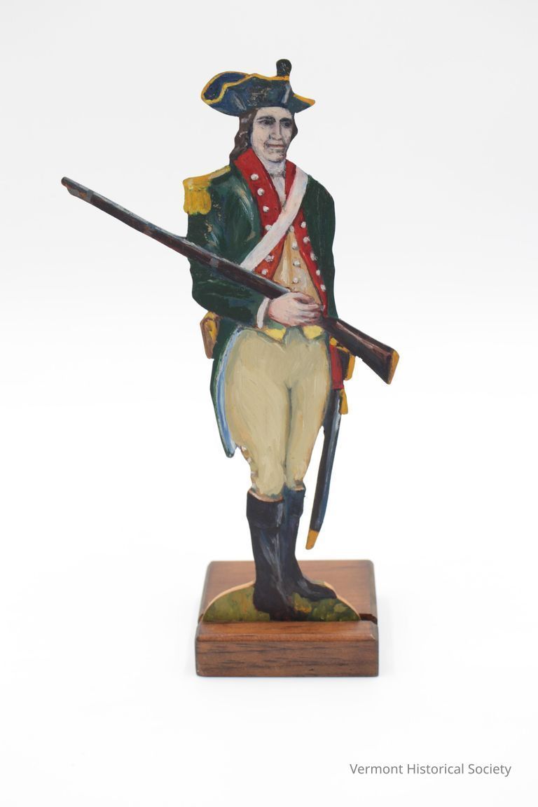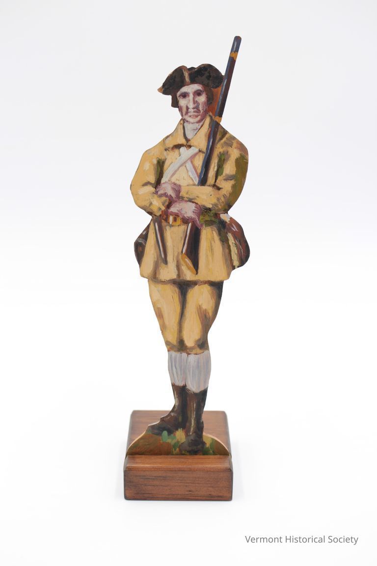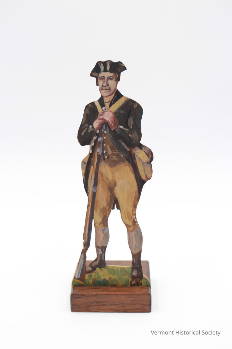 Plywood cutout figurine of soldier. The figure is painted on the front, and the plywood is left bare on the reverse. The soldier is shown wearing an eighteenth-century-style military uniform consisting of a black bicorn hat, a green coat edged in red, a fawn waistcoat, fawn breeches, and tall black boots. He is holding a long gun across his body with his right arm and there is a sword at his left hip. The figure sits in a slot within a rectangular wooden base. The back is stamped with the words, "JEHIEL HAWLEY STUDIOS by" and signed, "Horace Mills Abrams". It is inked with the inscription, "Lt. Ira Allen in Parade Uniform of Green Mountain Rangers and by N.Y. Pro. Congress July 4, 1775".