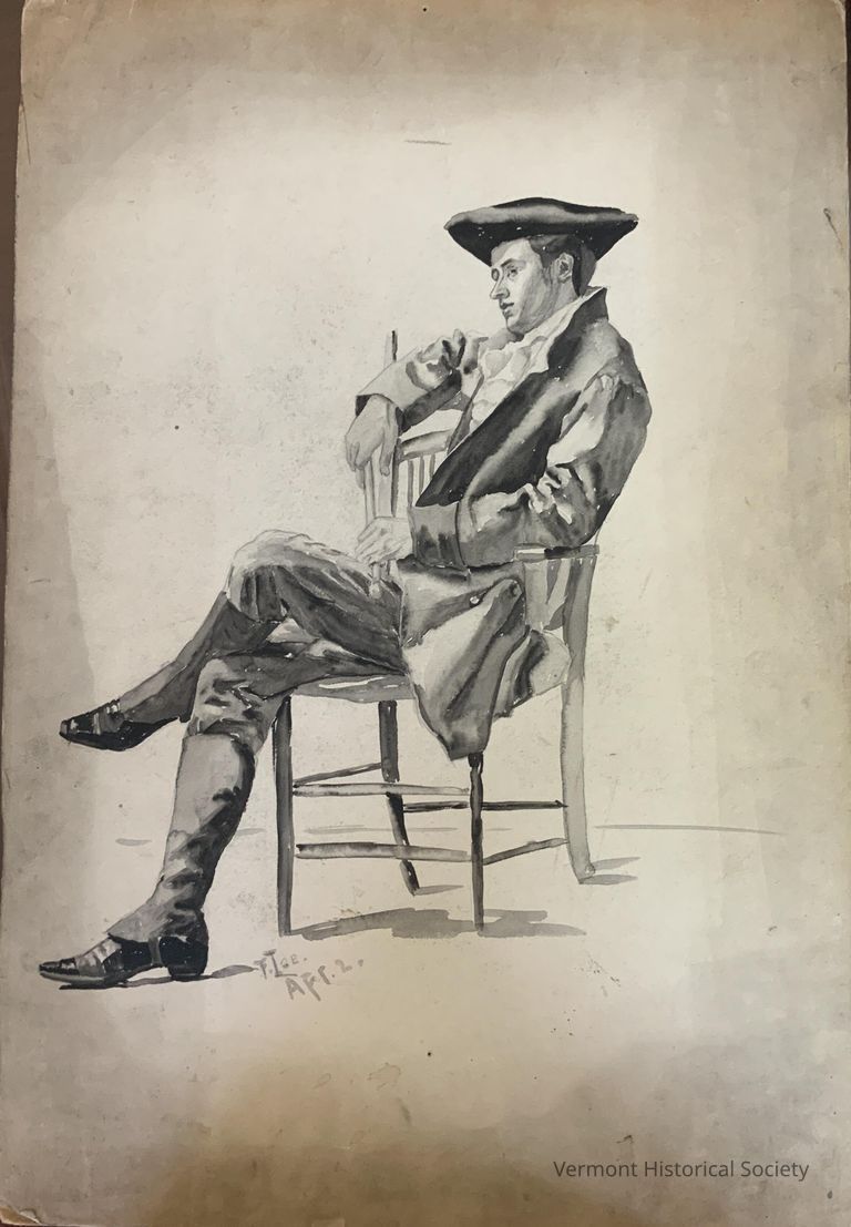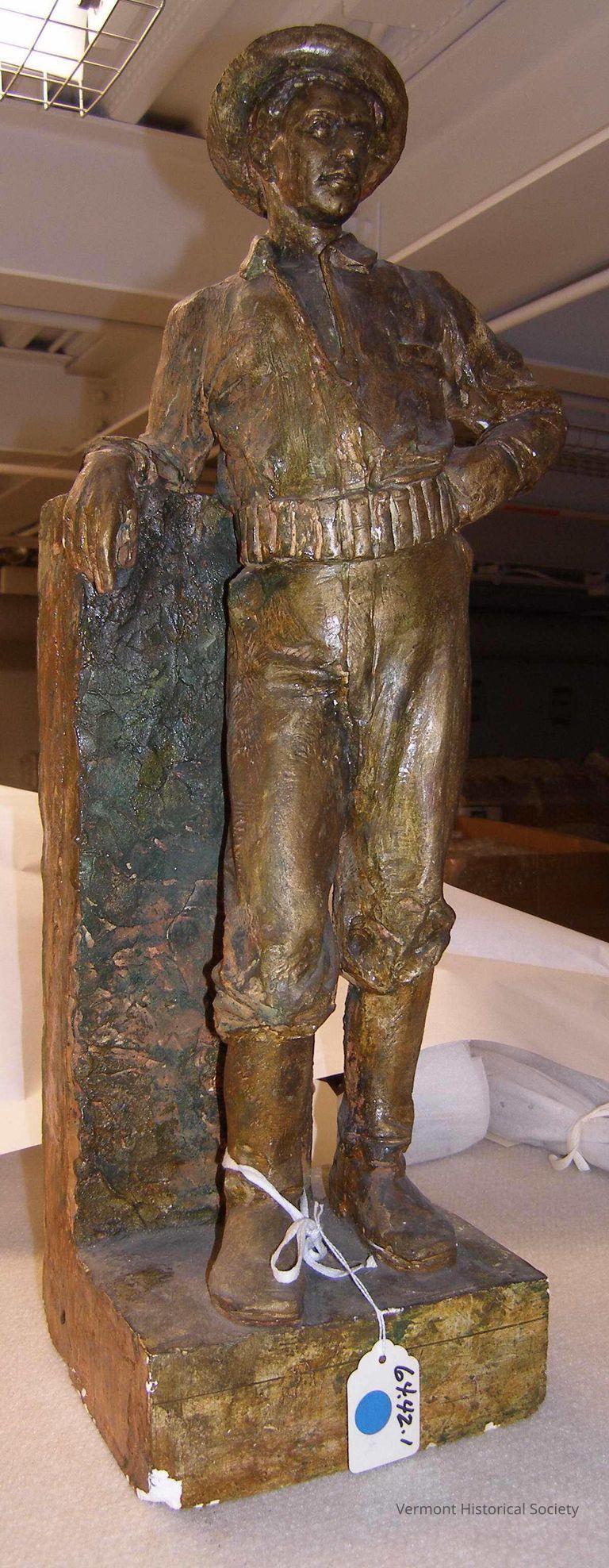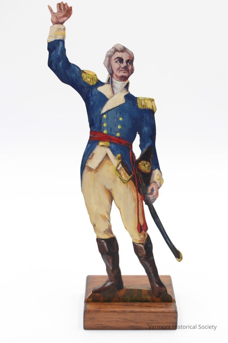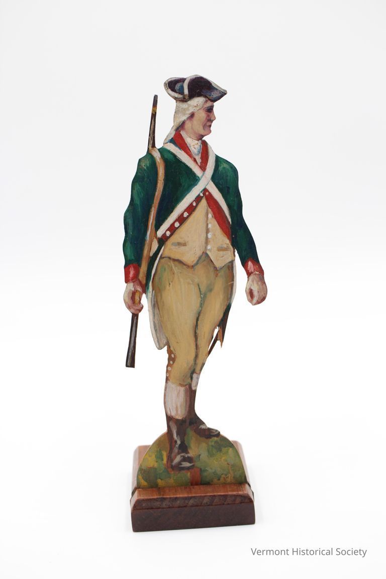 Plywood cutout figurine of soldier. The figure is painted on the front, and the plywood is left bare on the reverse. The soldier is shown wearing an eighteenth-century-style military uniform consisting of a black bicorn hat, a green coat edged in red, a fawn waistcoat, fawn breeches, and tall black boots. He is holding a long gun across his body with his right arm and there is a sword at his left hip. The figure sits in a slot within a rectangular wooden base. The back is stamped with the words, "JEHIEL HAWLEY STUDIOS by" and signed, "Horace Mills Abrams". It is inked with the inscription, "Lt. Ira Allen in Parade Uniform of Green Mountain Rangers and by N.Y. Pro. Congress July 4, 1775".