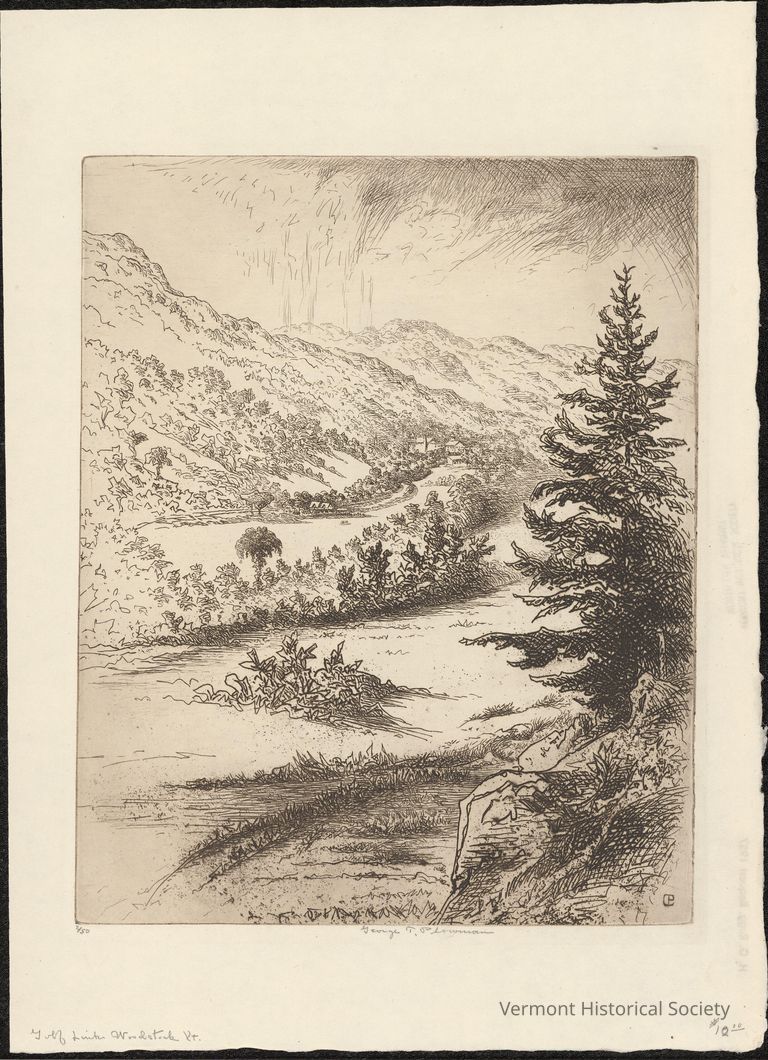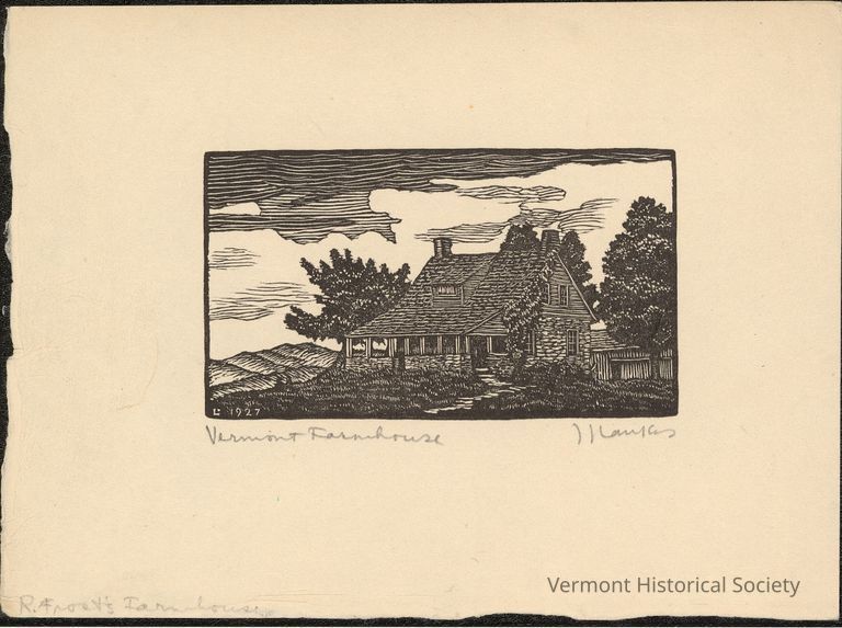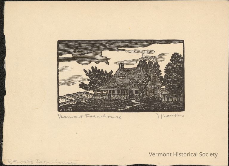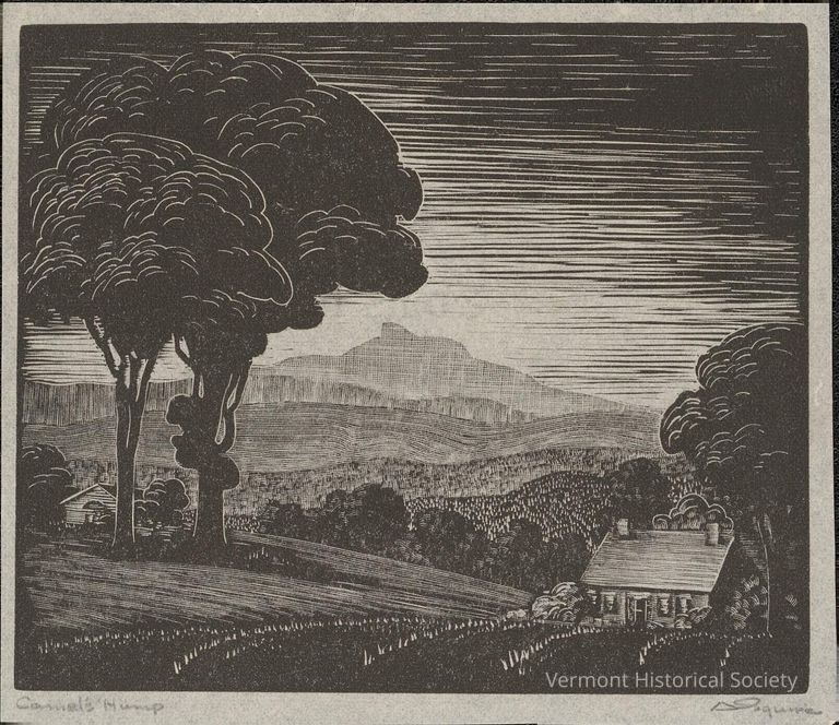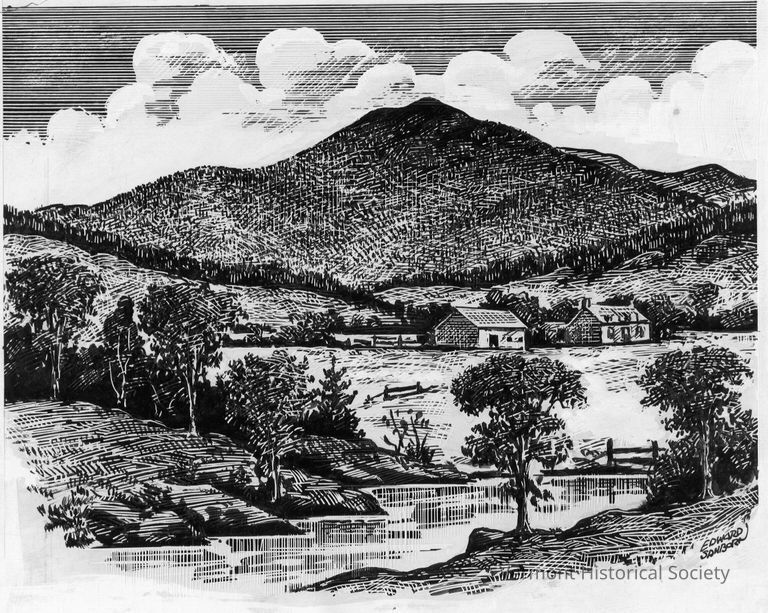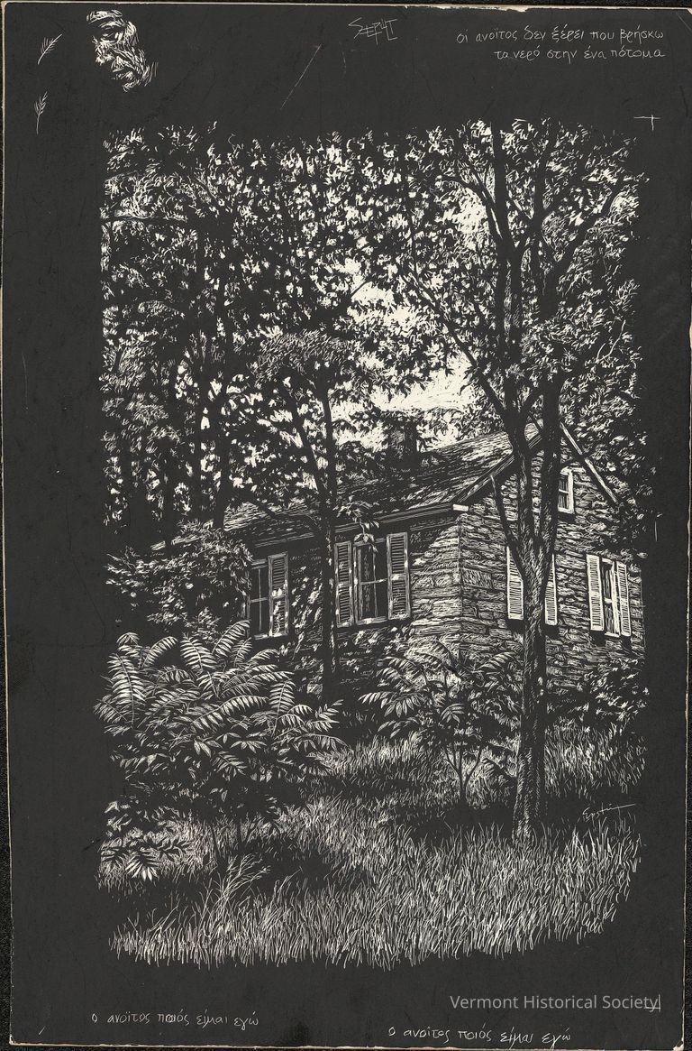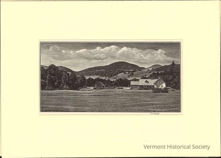Scratchboard etching showing Jay Peak with a house and barn. A river runs across the foreground.