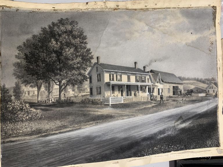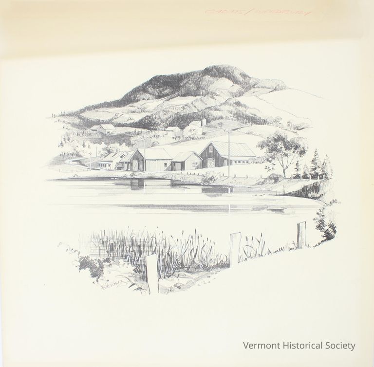 Drawing on board showing a small farm complex situated along a road by a pond.