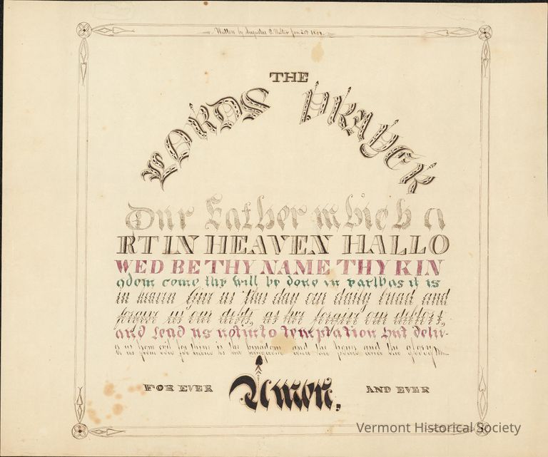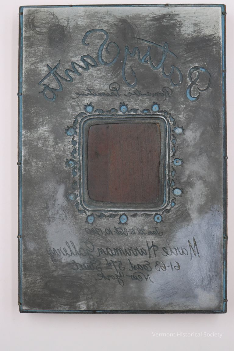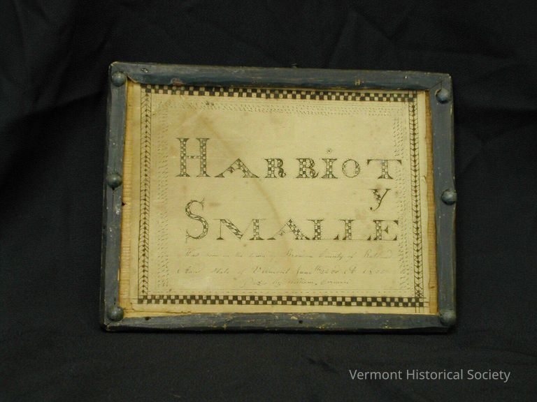 Framed, handwritten birth information of Harriot Smalley. The certificate consists of the name Harriot Smalley written in large copperplate letters, filled in with a checkered patter. The last letter of Smalley is placed between the two words. Her birth details are written in script beneath. The designed is framed by a checkered pattern at the top and bottom and a chevron or X pattern on the sides. The certificate is held in a black-painted wooden frame, decorated with rivet-type nails. A note on the back of the frame reads, "This frame was made by uncle Osange Smalley (brother of Harriot) when he was only five years old. The pen work was by a schollar [sic] of here while she was teaching in Brandon Vt. D. A. G."