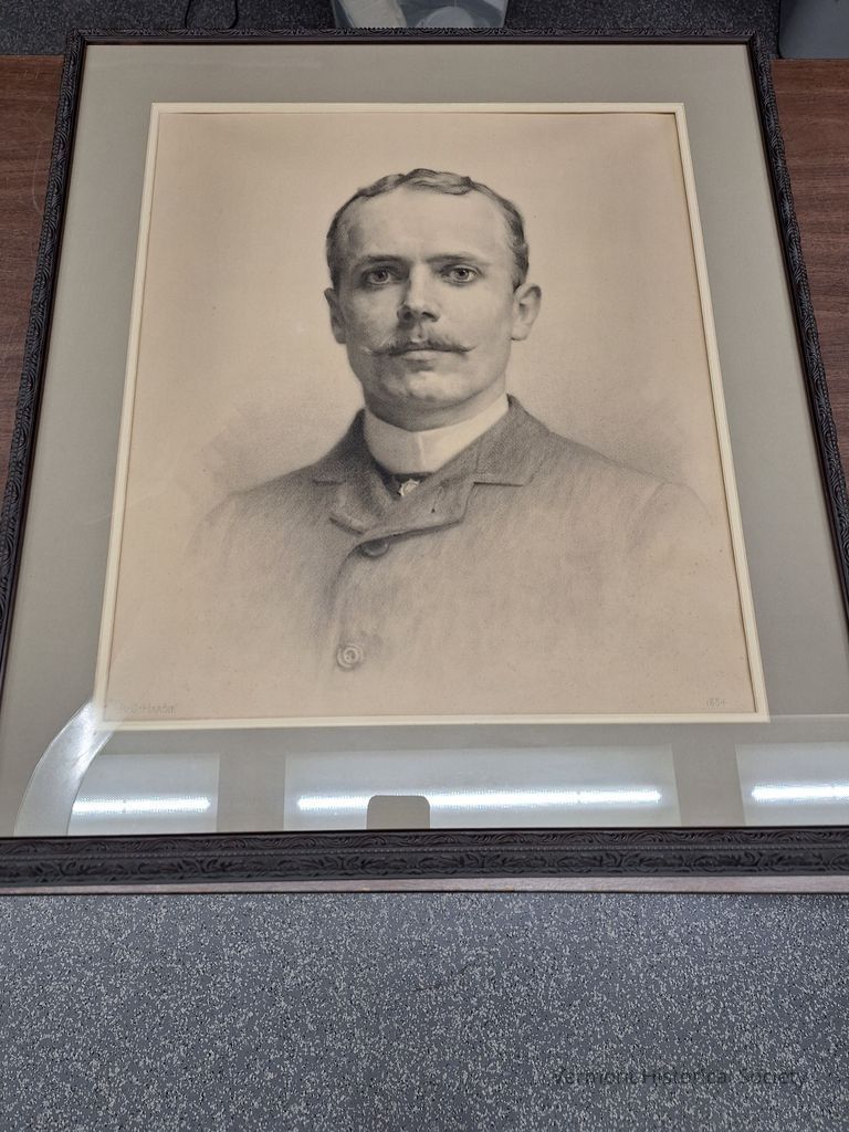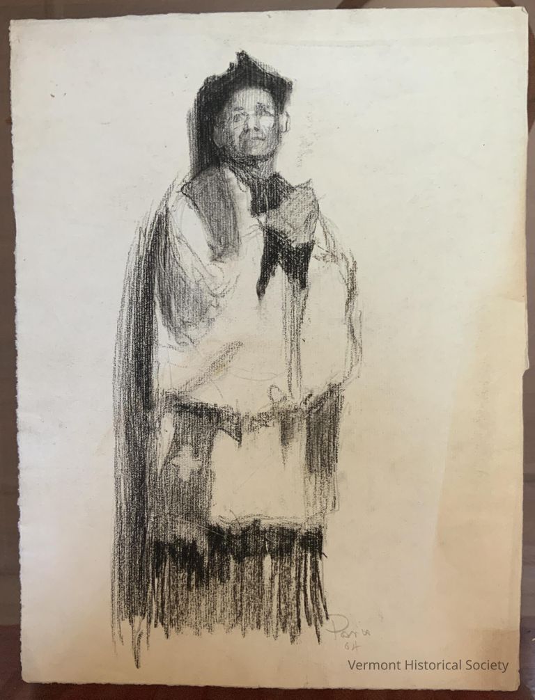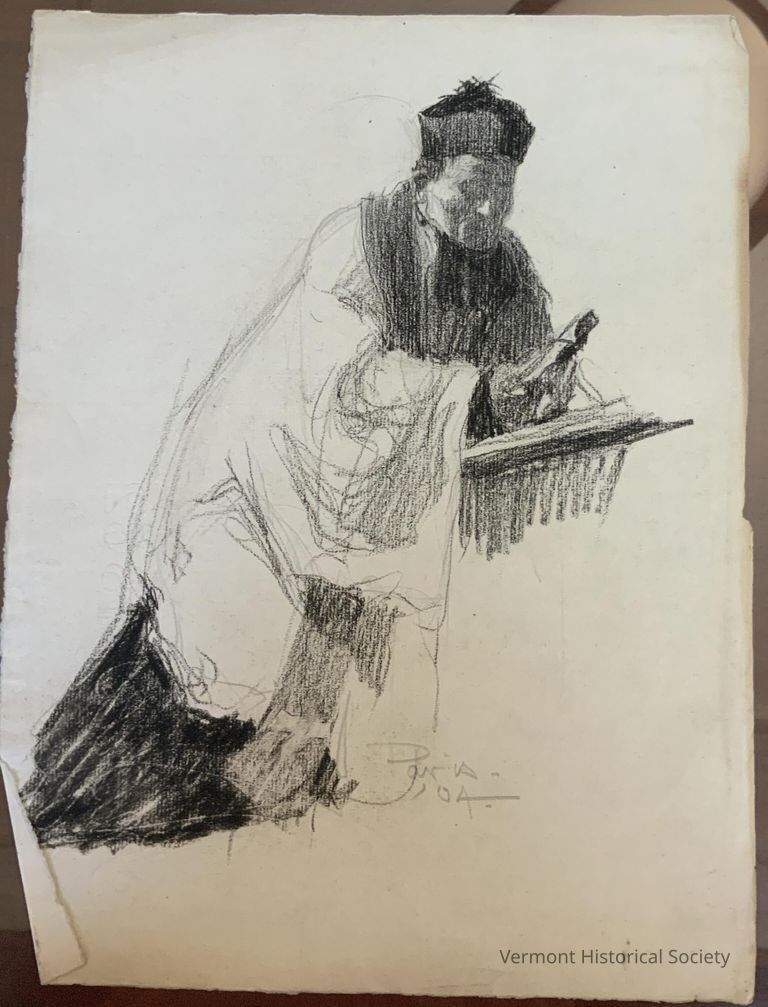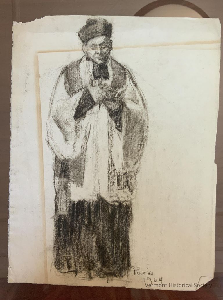 A drawing of a clergyman sitting against the wall and holding his cap in his hands. He wears glasses and robes. There is some graphite detailing among the charcoal. Signed only with “Paris 1904.”