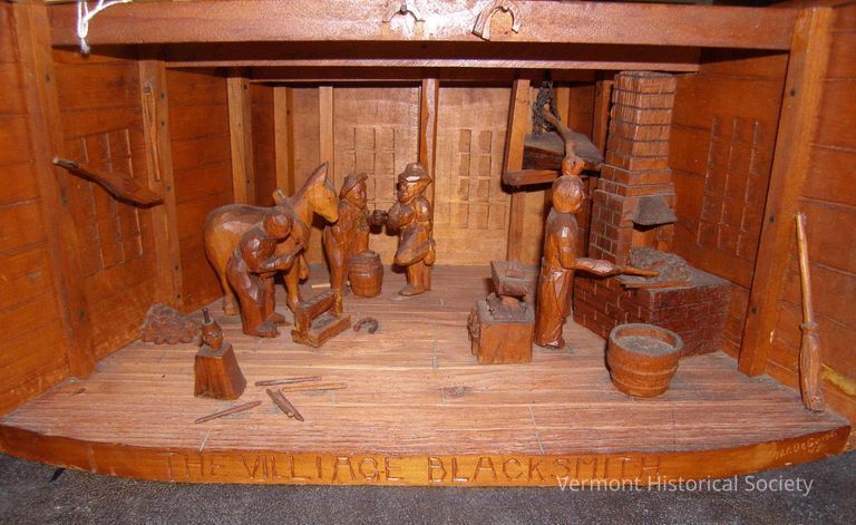 Carved wooden diorama showing the interior of a building in which several men are working. One is shoeing a horse or donkey, two are talking, and another is working a large, ceiling-mounted bellows and forging an object within a fire. Objects around the room include tools, a barrel/bucket, a broom, a tool case, and an anvil. The bottom front is carved with the title, "THE VILLAGE BLACKSMITH". On the upper right corner is the inked label, "REPLICA PETE HURLBERT SHOP STOWE ST WATERBURY VT 1814".