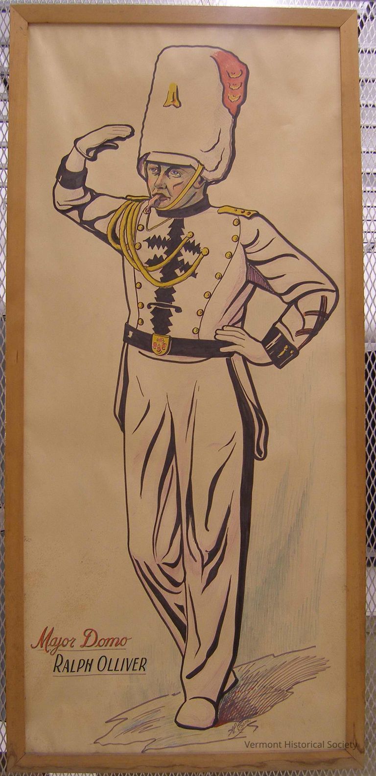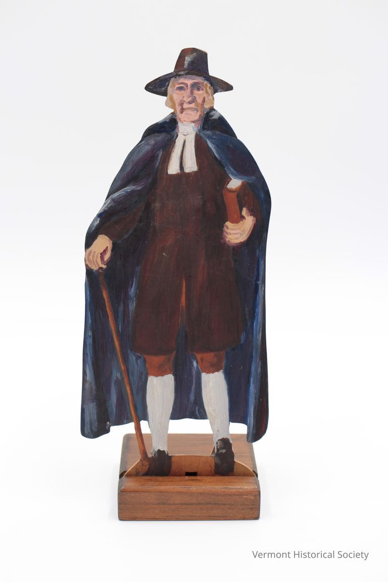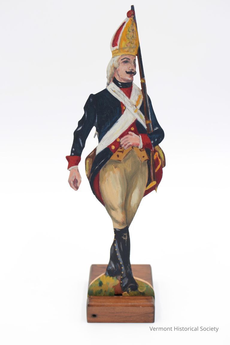 Plywood cutout figurine of soldier. The figure is painted on the front, and the plywood is left bare on the reverse. The soldier is shown wearing an eighteenth-century-style military uniform consisting of a tall gold hat, a blue coat trimmed with red, a tan waistcoat, fawn breeches, black leggings, and black shoes. He is holding a long gun over his left shoulder and has a curled black mustache. The figure sits in a slot within a rectangular wooden base. The back is incised with the inscription, "Green Mountain Ranger / Parade Uniform / Horace Mills Abrams".