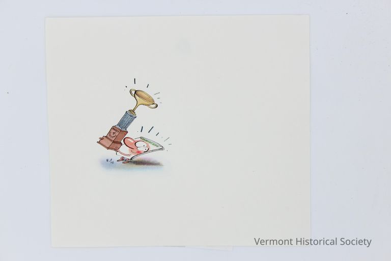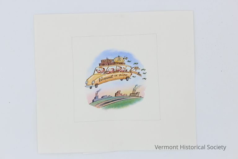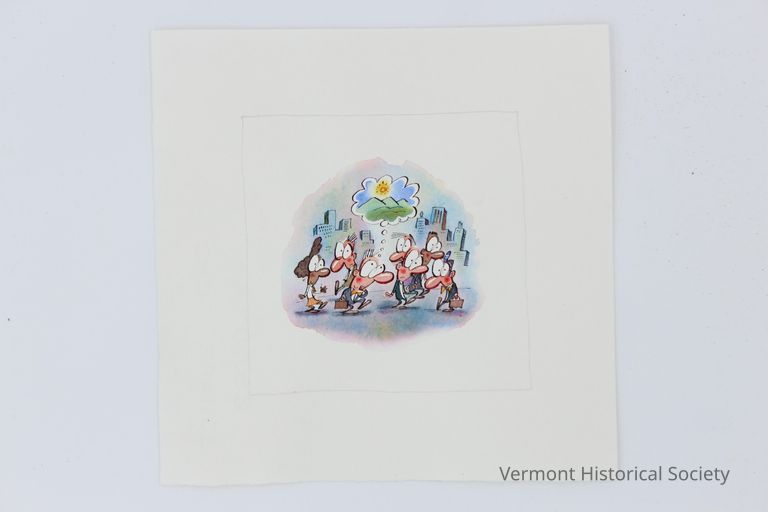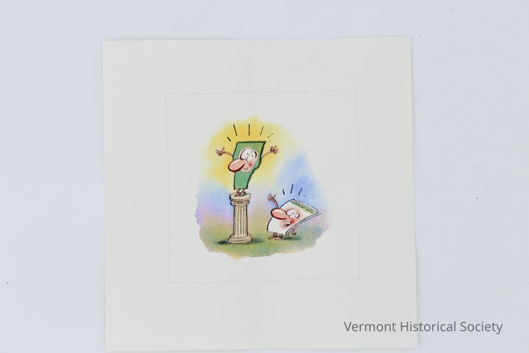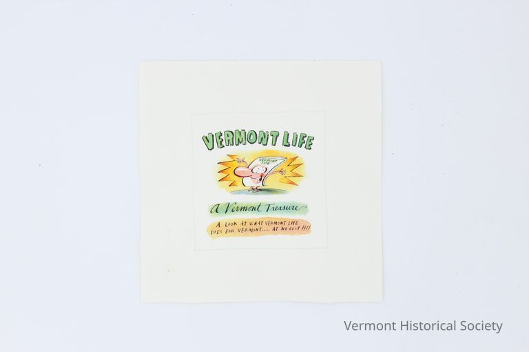 Original watercolor illustration showing a anthropomorphized sheaf of paper and the words, "VERMONT LIFE/A Vermont Treasure/A LOOK AT WHAT VERMONT LIFE DOES FOR VERMONT..... AT NO COST!!!!"