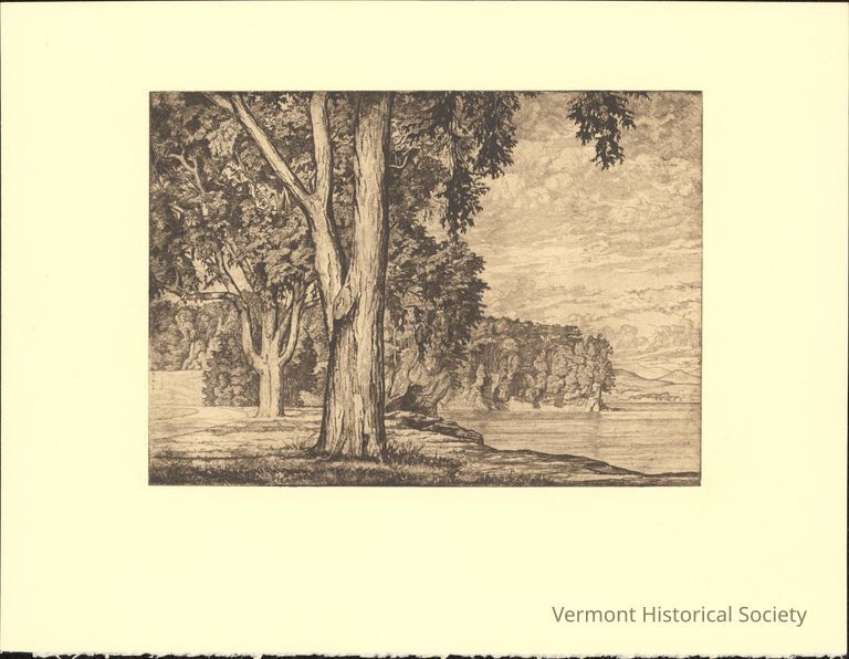 Framed photographic postcard showing a shoreline with grass and trees in the foreground. The card is mounted onto a matboard and labeled, "Lake Champlain", at the bottom left. It is signed, "J. C. Bicknell" at the bottom right.