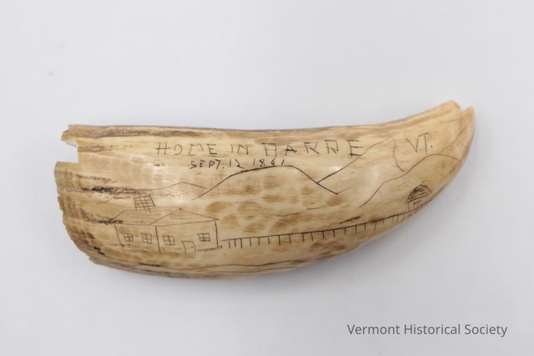 Whale tooth decorated with scrimshaw carving. The carving shows a rudimentary landscape consisting of five mountains with a house, outbuilding, and fence in from. The house is square with a peaked roof, a chimney, two windows per side, and a central front door. The fence consists of a horizontal line with evenly-spaced vertical lines beneath it. The outbuilding sits at the far end of the fence from the house, near the point of the tooth. The carving is labeled, "HOME IN BARRE VT. SEPT. 12 1861".