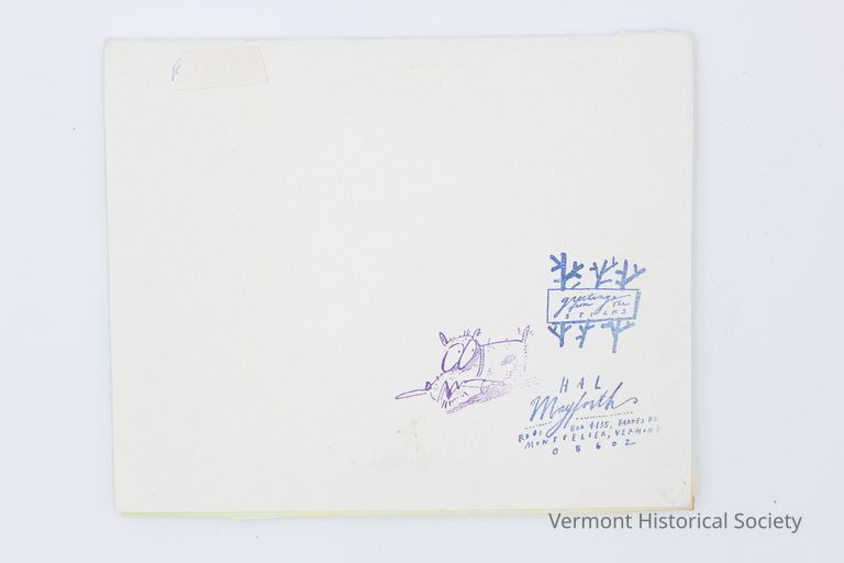 Bi-fold envelope for holding artwork. The front of the enveloped is stamped with three images: a dog holding a fountain pen; a sign saying "greetings from the sticks" held by three sticks; and the artist's information, "HAL/Mayforth/RD #1 Box 4135, BARNES RD./MONTPELIER, VERMONT/05602."