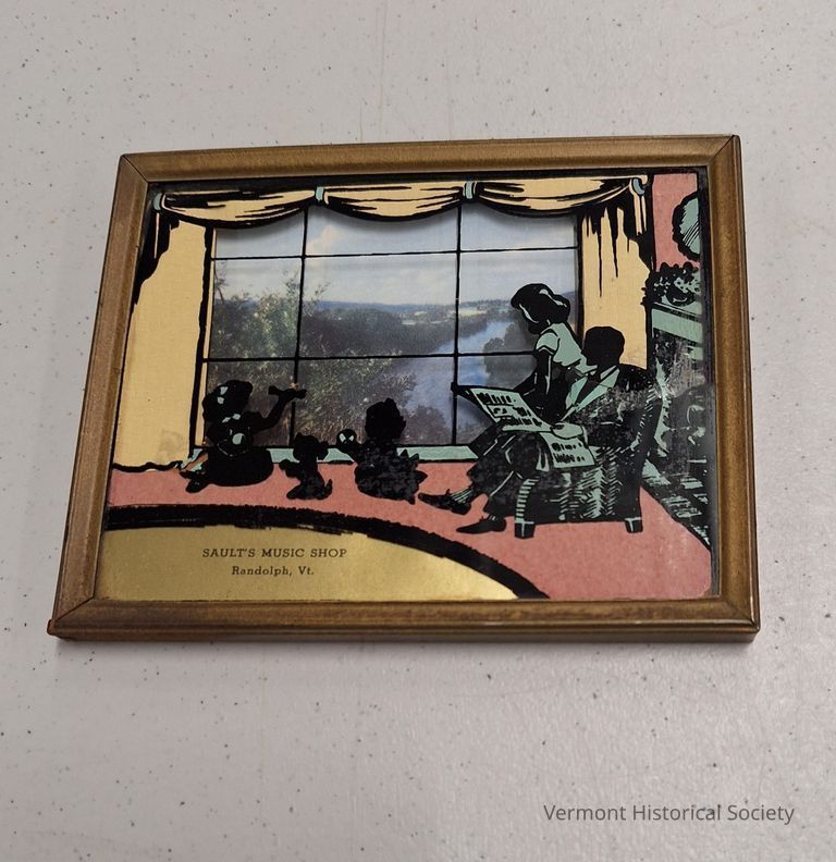 Reverse-painted glass miniature of a family playing in an interior setting with a printed photographic image of a river outside the window. The lower left corner reads, "SAULT'S MUSIC SHOP / Randolph, Vt."