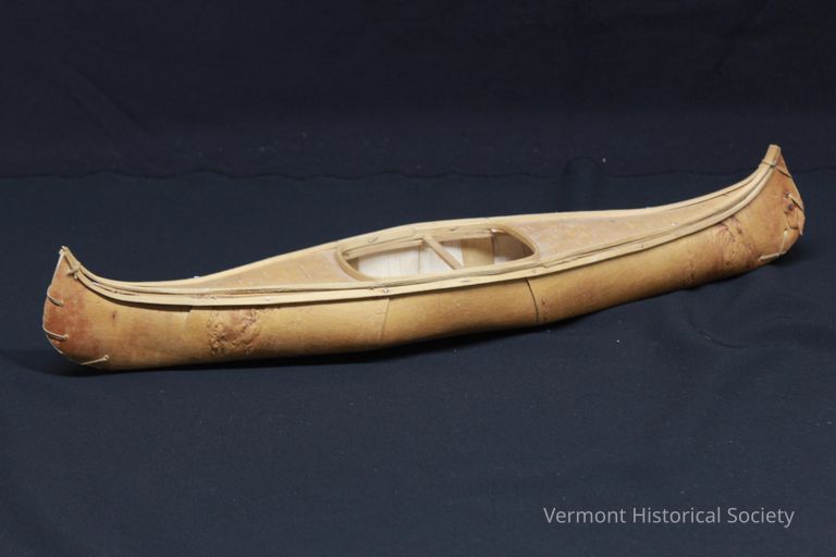 Miniature birch bark canoe. The hull of the canoe is constructed of birchbark, bent into shape and secured with small nails to splint around the top. The two ends are stitched together. The top is enclosed except for a central opening rimmed with a small wooden splint.