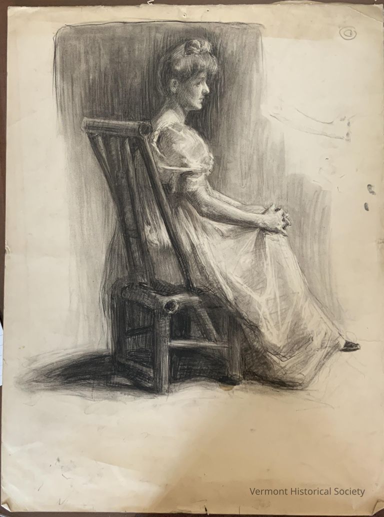 A full length portrait of a woman in profile sitting in a chair. The chair is carved and ornate. She wears a dark dress with a kerchief around her neck and her hair is up. There are shadows around her. Signed in the bottom right corner and undated.