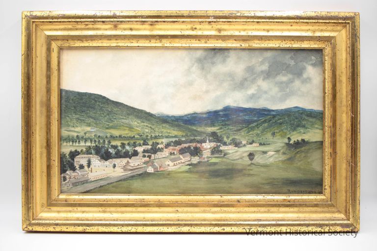 Watercolor painting showing a town in a valley. The town (Waterbury, Vermont) is situated to the left of a straight railroad track running from the lower left corner of the painting to the center horizon. The buildings are carefully drafted, with pencil marks visible through the paint. Green hills rise up behind and to either side of the town, with blue mountains in the far distance. Grey clouds darken the sky at the upper right. The painting is in a gilded frame, and the backboard is cut away in sections on the reverse to reveal the handwritten title.