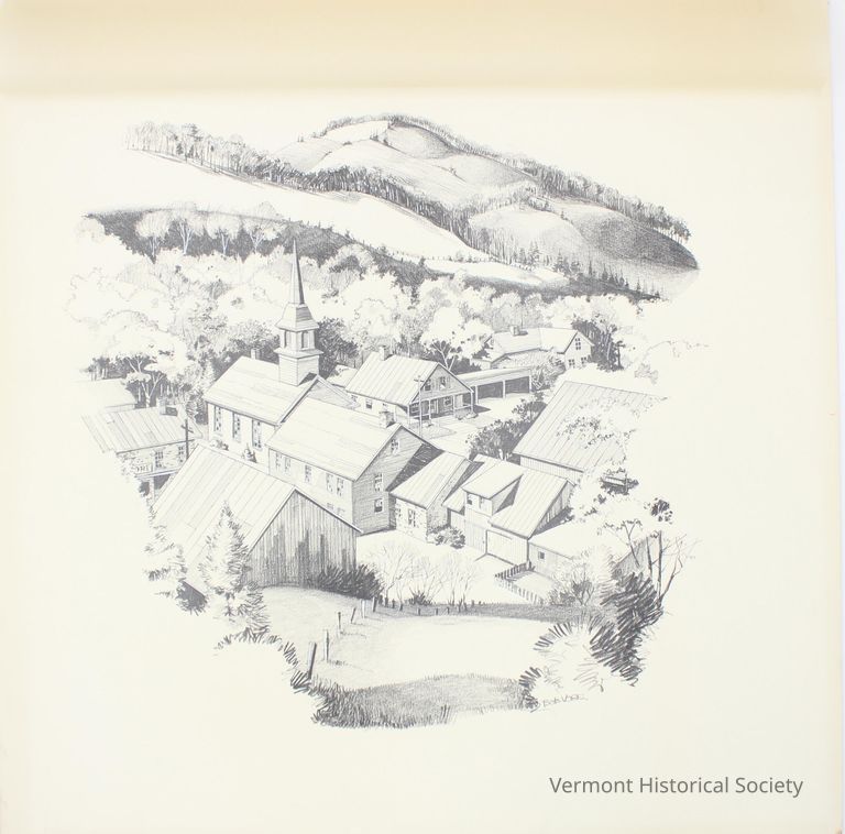 The proper right side shows an aerial view of a town center, with a white steepled church at center. Additional red and white buildings dot the rolling hills, which are painted in both greens and golds.