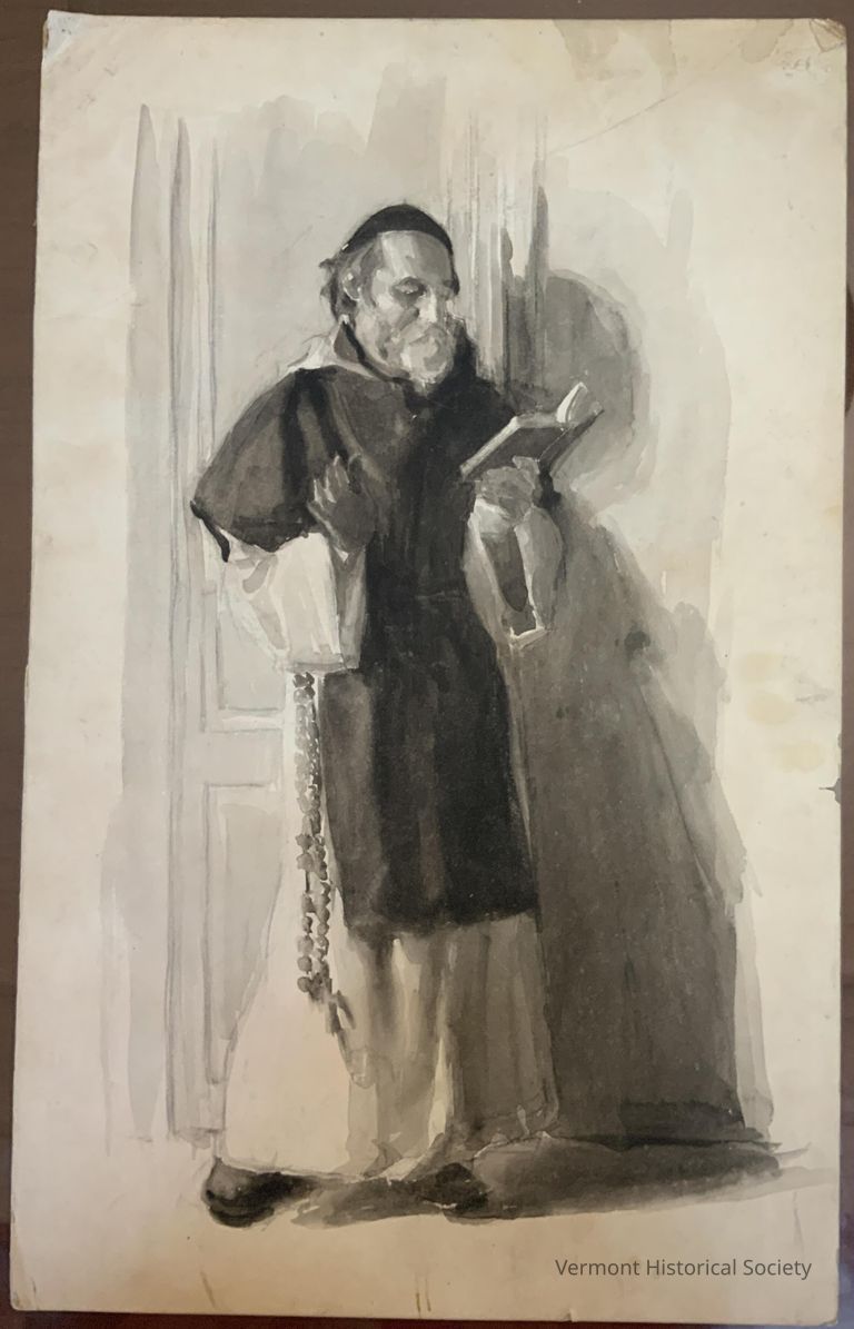 A drawing of a clergyman reading a small book that he holds in both hands. He wears long robes and a small hat. Signed only with “Paris 1904.”