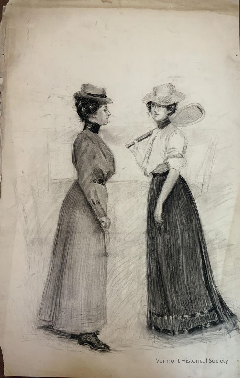 A drawing of two women. The one on the left is wearing a grey dress and a hat. The other woman wears a dark skirt and white blouse with a hat and carries a racquet. It is unsigned and undated.