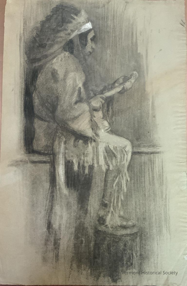 A drawing on grey paper of a Native American man sitting in profile. He holds an object in his hands. It is unsigned and undated.
