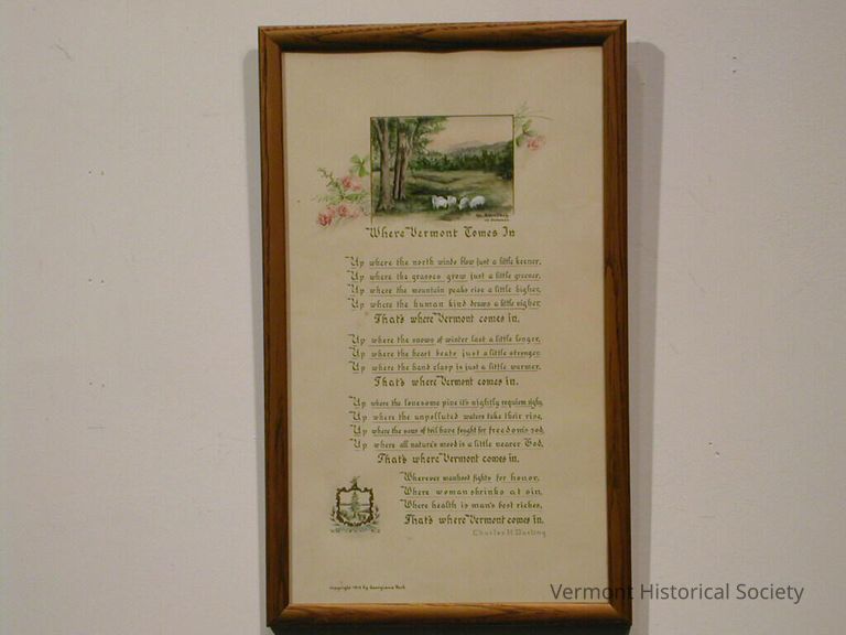 Square birdhouse with peaked roof painted all over with images of Vermont. The front is painted with a stylized version of the Vermont seal, featuring bales of wheat and a cow in a field flanking a tree. The bust of a deer (in the form of a crest) surmounts the opening, and the base is framed with two tree branches and the words "FREEDOM/VERMONT/UNITY" in a red ribbon. A small dowel protrudes out from underneath the opening to act as a perch.