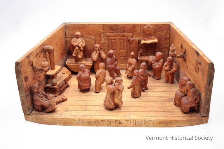 Wooden diorama scene showing several people dancing in a kitchen. The room, or box, is carved with the label, "A VT. KITCHEN TUNKET". The walls of the diorama are carved to represent a simple interior, with bead board or planking on the lower half of the walls, and a four-paneled door at the center back. From right to left, the scene includes a seated woman, a dog and puppies, a shelf of accessories, a stove, a fiddler atop a table, a step caller, four dancing couples, a clock on a shelf, two standing men, lanterns on a shelf, and two seated women.