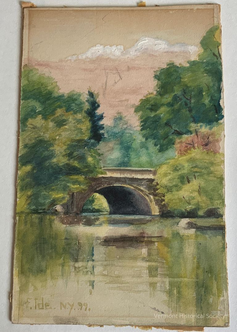 A watercolor mounted on cardboard showing a bridge over a body of water surrounded by trees with a pink cloudy sky above. Signed in the bottom left corner and dated “NY 99.” Writing on the back.