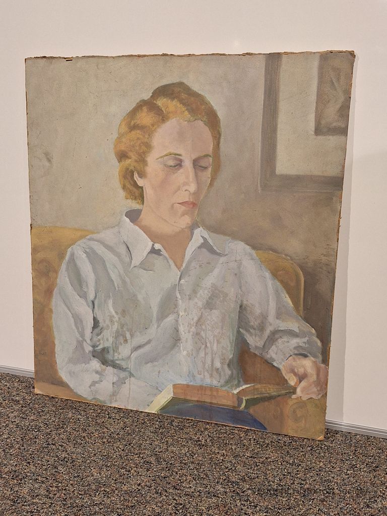 A drawing of a woman sitting in a chair. She wears a dark dress with a centerpiece that’s lighter, a large ruff collar, and spectacles. There is a painting behind her. Signed in the bottom right corner.