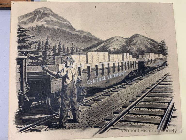 Charcoal drawing showing a man and train. The man is placed toward the foreground, and is shown wearing overalls and a conductor's hat. He is beckoning out of frame to the left, presumably to the engine car. Two train cars are in frame, both bearing the inscription, "CENTRAL VERMONT," in white paint. The cars are flat-topped, sideless freight cars and appear to be holding lumber. Evergreen trees and two mountains can be seen in the distance.