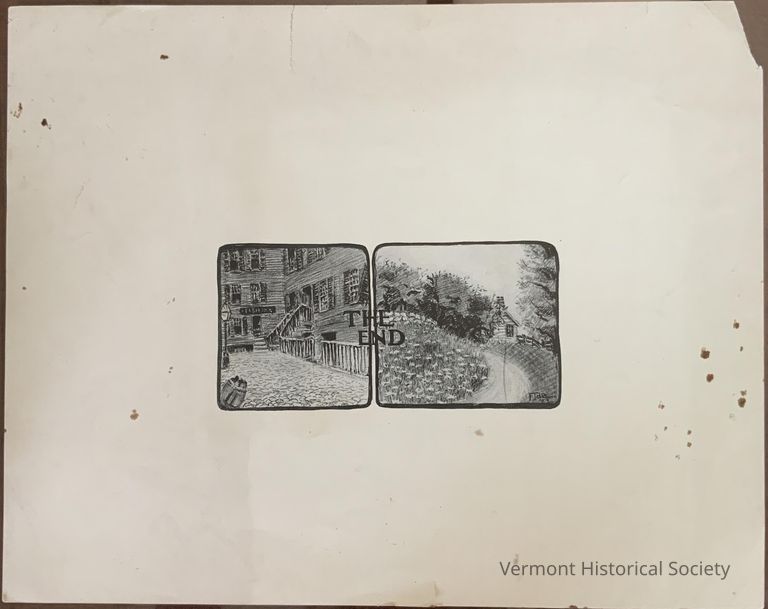 A print of a drawing of two squares and “the end” written over them. The left square has a street and some buildings in view and the right has a country road with flowers and a cottage visible behind some trees. It is signed in the bottom right corner and dated “‘03.”