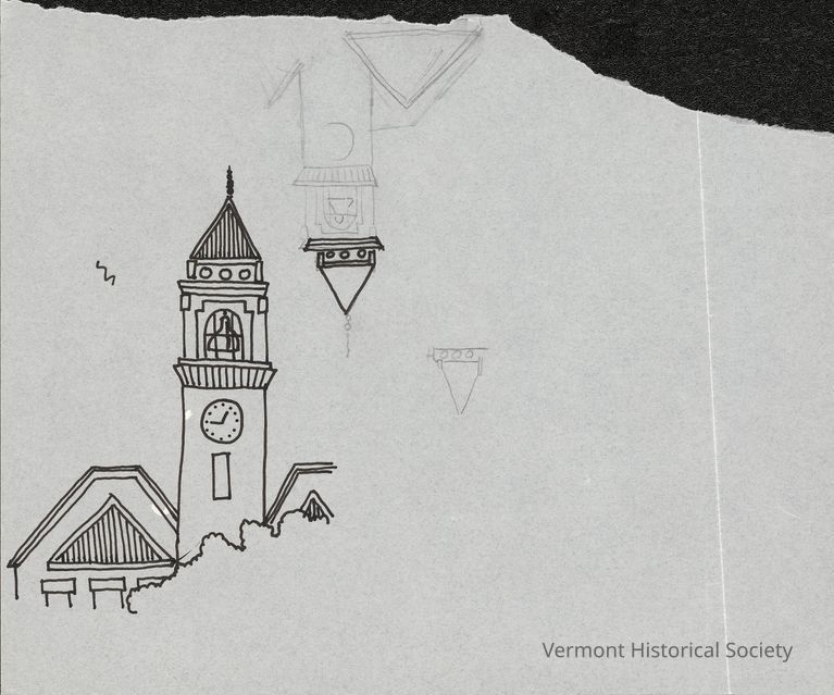 Pencil sketch and inked line drawing on tracing paper. Both drawings show the same tower, but are oriented opposite each other. They show a tower with a pointed top, a bell, and a clock, above two roofs and a treeline.