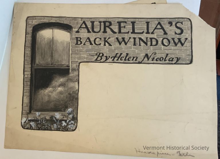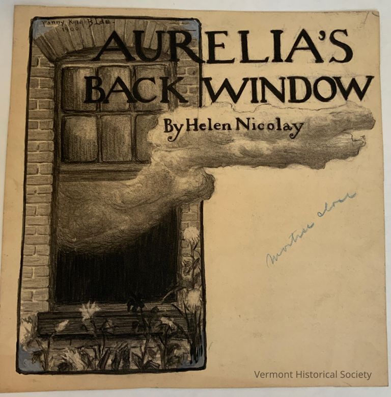 The title page for “Aurelia’s Back Window” bu Helen Nicolay. It takes up 3/4 of the paper and shows a window with smoke escaping it and flowers below to the left of the title. It is in black and white and also uses charcoal. Signed in the bottom left corner and dated 1900.