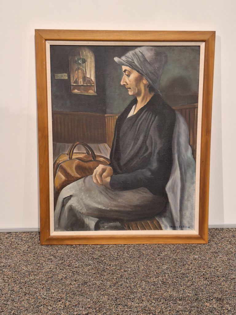 A full length portrait of a woman shown in 3/4 view from behind. She wears a white blouse and a dark skirt and her hands are clasped behind her. It is signed in the bottom right corner.